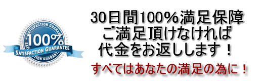 この商材を購入して30日間、実践してください。もし30日間、この商材の中で書かれている・話されているノウハウやテクニックを実践したにもかかわらず、教材代金の9,800円すらも稼げないと判断された場合、実践していただいたことを提示していただければ、2週間以内に返金事務手数料3,000円を引いた6,800円を、ご指定いただきました銀行口座に返金させていただきます。返金申請可能期間は、ご購入から37日後〜60日後までの間とさせていただきます。
